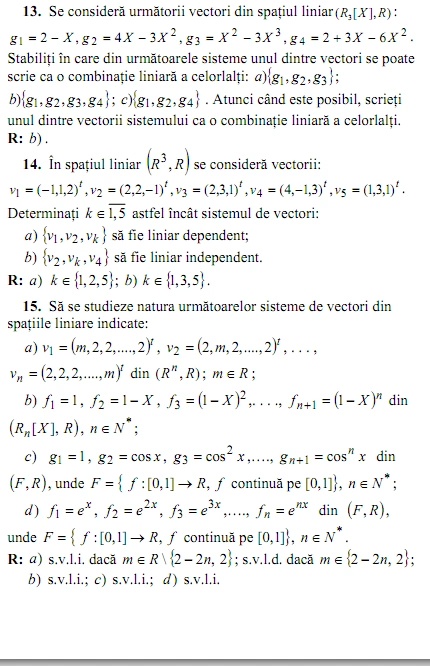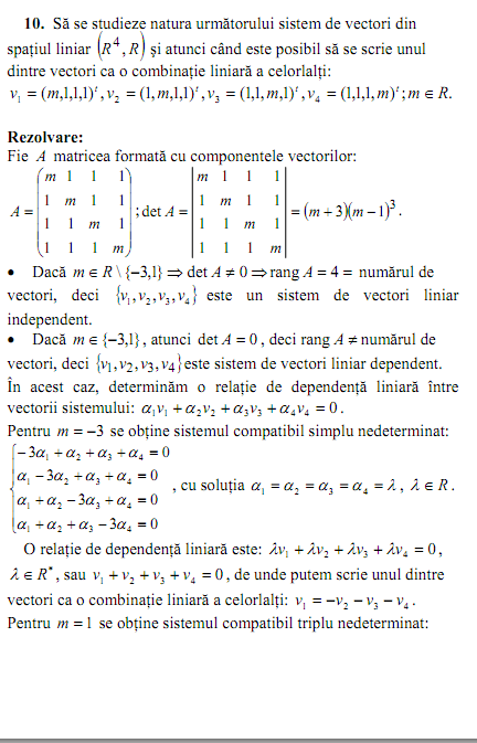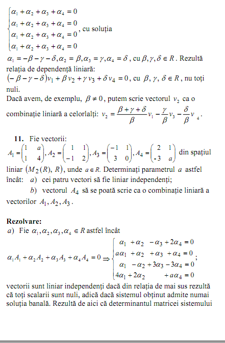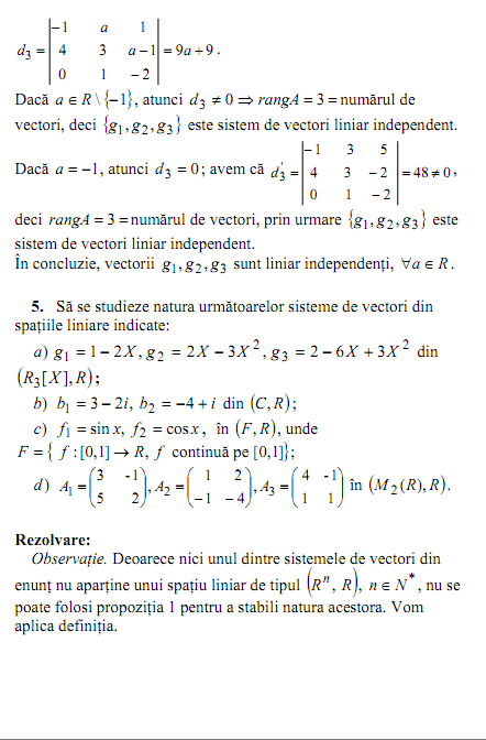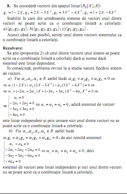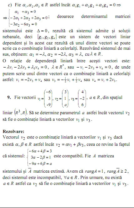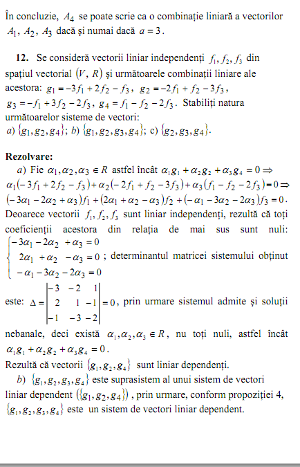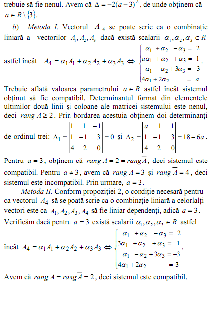 Deoarece vectorii sunt liniar independenţi, rezultă că nu se poate scrie ca o combinaţie liniară a vectorilor şi
