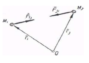 Se consideră două puncte materiale şi asupra cărora acţionează forţele interioare şi respectiv (figura 7). Fie şi vectorii de poziţie ai punctelor şi în raport cu punctul fix 0.