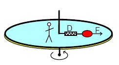 Pe un disc ce se poate roti în jurul unei axe, este aşezat un corp, legat de axa prin intermediul unui dinamometru. În timpul rotirii discului, observatorul de pe disc pune în evidenţă, cu ajutorul dinamometrului, o forţă F. Apare o nedumerire din partea observatorului: deşi asupra corpului acţionează o forţă totuşi corpul nu se mişcă pe disc. Pentru a rezolva dilema, observatorul ataşează corpului o forţă
