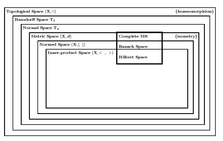 Spaţiile abstracte ale matematicii superioare. Săgeata indică incluziunea: Mulţimile din originea săgeţii sunt incluse în cele din vârf.