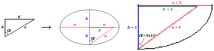 The parameters of an ellipse involve the same components and behave the same way as any right triangle, with one major exception: Physically speaking, there is no hypotenuse, only two "legs"—the semi-major, or transverse, and semi-minor, or conjugate, axes, or (as applied to a sphere or ellipsoid) the equatorial (or transverse) and polar (or conjugate) radii, and . Instead, an equivalent right triangle is created and defined, where