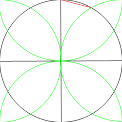 Starting at the top of the circle, where the verticle line meets the curve, draw a line from there to the nearest point where the large circle's curve intersects with a line or another curve.