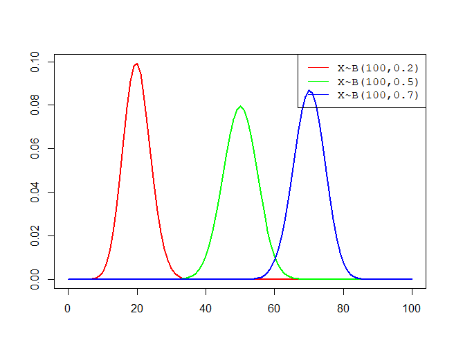 R 语言的二项分布分布律函数为dbinom,一些不同参数的二项分布分布律为