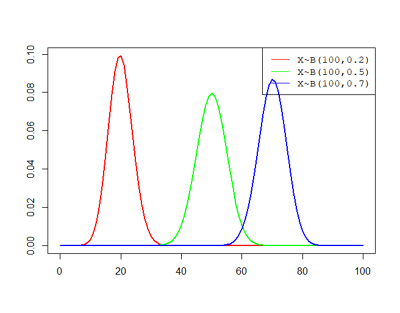 设在伯努利试验,那么事件发生次()的概率是 例如,在摸球模型中:一个袋中装有除颜色不同外其余情况均相同的若干个红球和黄球,抽到红球的概率是,有放回地从袋中抽出个球,抽到个红球的概率就满足上述分布。