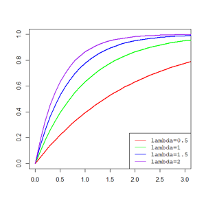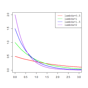 R 语言的指数分布密度函数为dexp,分布函数为pexp,一些不同参数的指数分布密度函数和分布函数为