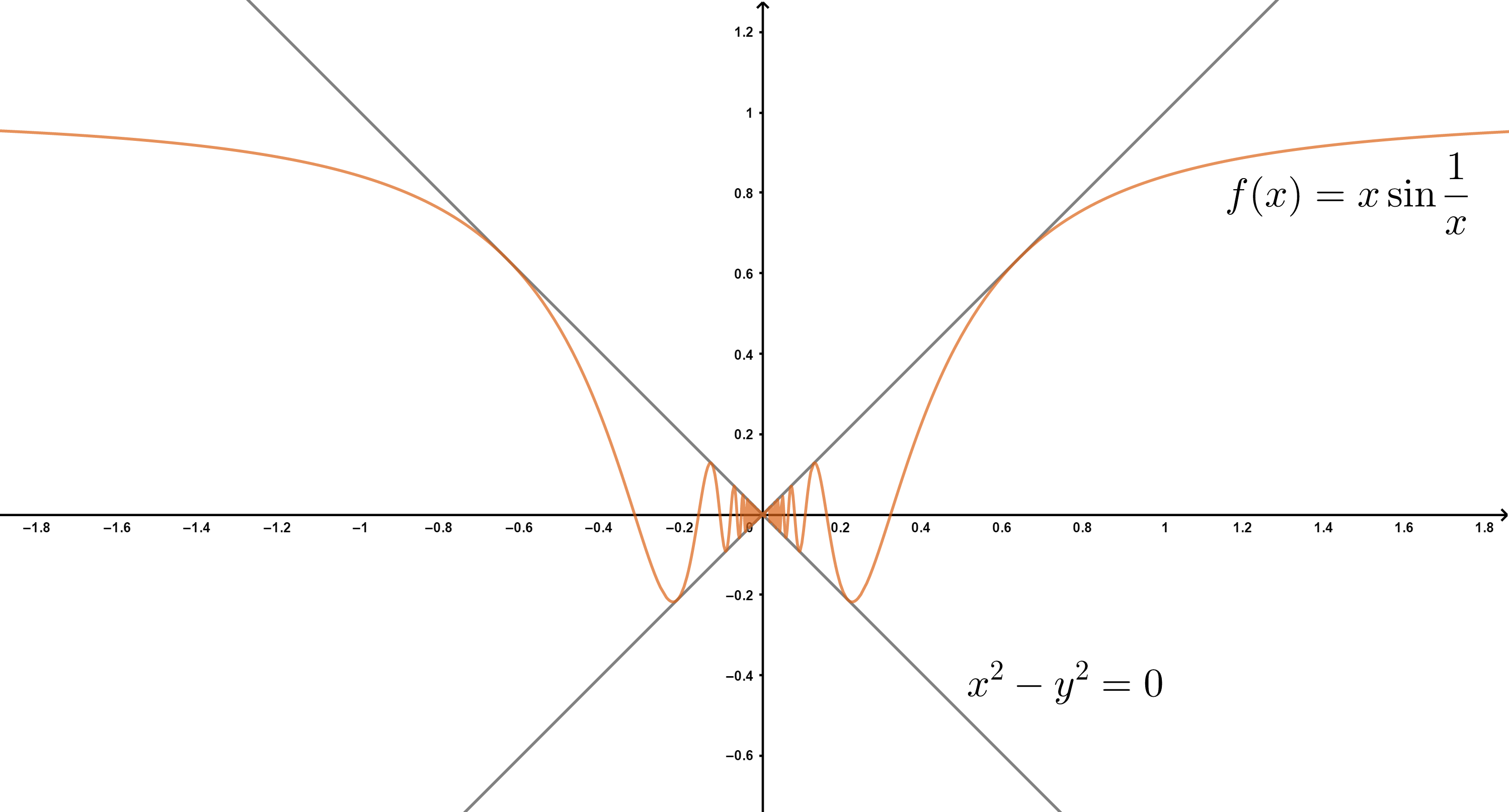 这个函数的图像,它的所有值都落在 x = y 和 x = -y 之间